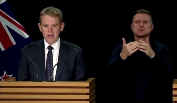 (Chris Hipkins (kiri) pada sidang media pengumuman