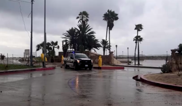 (Pegawai polis berpakaian baju hujan memantau ombak ketika angin