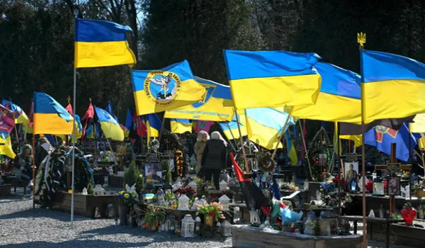 (Pelawat berdiri di antara kubur bendera kebangsaan Ukraine di tanah perkuburan tentera