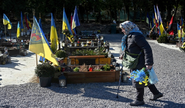 (Seorang pelawat membawa bunga ketika dia berjalan melalui tanah perkuburan tentera Lychakiv/AFP)