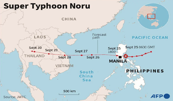 Media sebelum ini melaporkan bahawa lima anggota penyelamat di Filipina maut akibat taufan Noru melanda utara negara itu, menyebabkan kejadian banjir dan berjuta-juta orang terputus bekalan elektrik. -BERNAMA