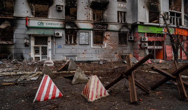 yang rosak dan terbakar ketika bunyi tembakan berterusan di Bakhmut,