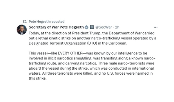 “Hari ini, atas arahan Presiden Trump, Jabatan Pertahanan melaksanakan serangan ke atas satu lagi kapal pengedar dadah yang dikendalikan organisasi pengganas yang diiktiraf (DTO) di Caribbean.