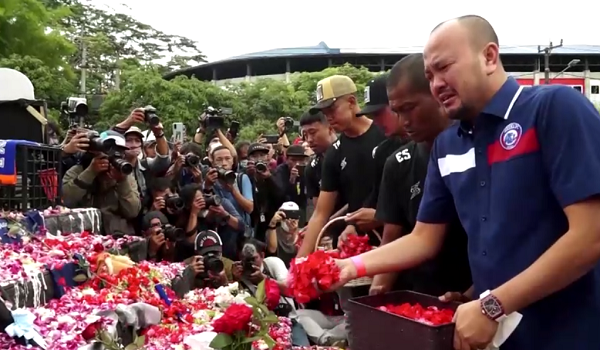 (Pengurus Arema FC, Ali Fikri (kanan) kelihatan menangis semasa menaburkan bunga
