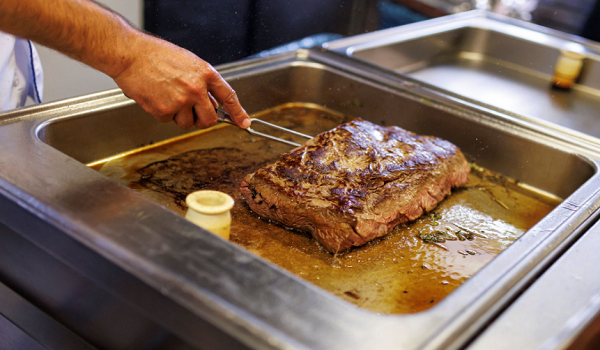 (Seorang tukang masak memanggang daging dalam minyak bunga matahari