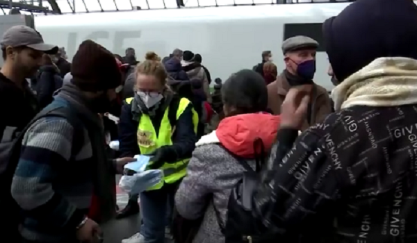 (Sukarelawan mengagihkan topeng muka kepada pelarian Ukraine yang baru sampai di Berlin Central Station/REUTERS)