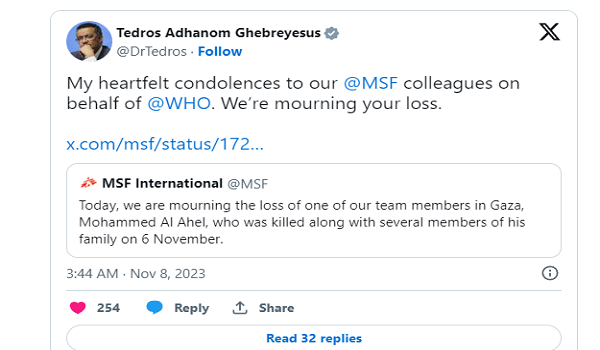 GENEVA, 8 November – Ketua Pertubuhan Kesihatan Sedunia (WHO) telah menzahirkan ucapan takziah kepada ‘Doctors Without Borders (MSF)’ selepas badan bukan kerajaan (NGO) itu mengumumkan kematian ahli pasukan dalam serangan udara tentera Israel di Gaza.