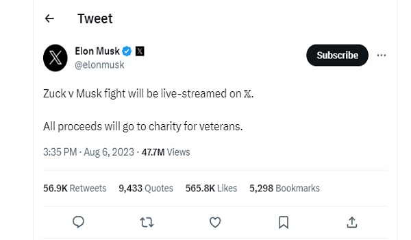 “Pertarungan Zuck v Musk akan disiarkan secara langsung di X,” kata Musk. “Semua hasil kutipan akan disalurkan kepada badan amal untuk veteran.”