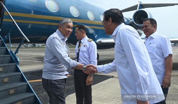 Datuk Seri Dr Ahmad Zahid Hamidi arrived at the Royal Malaysian Air Force Base at 10:30 this morning using a special plane from the capital to be greeted by Deputy Minister of Rural and Regional Development Datuk Rubiah Wang and Deputy Minister of Utilities and Telecommunications Datuk Dr Abdul Rahman Junaidi.