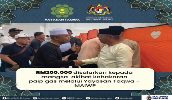 PUTRA HEIGHTS, 3 April – The Taqwa Foundation of the Federal Territory Islamic Religious Council (MAIWP) has made an initial contribution of RM200,000 to assist the victims of the recent gas pipe fire incident in Putra Heights.