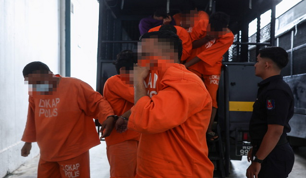 Terdahulu, kesemua suspek tiba di pekarangan Kompleks Mahkamah Kota Bharu pada 8.30 pagi dengan berpakain lokap polis berwarna oren.