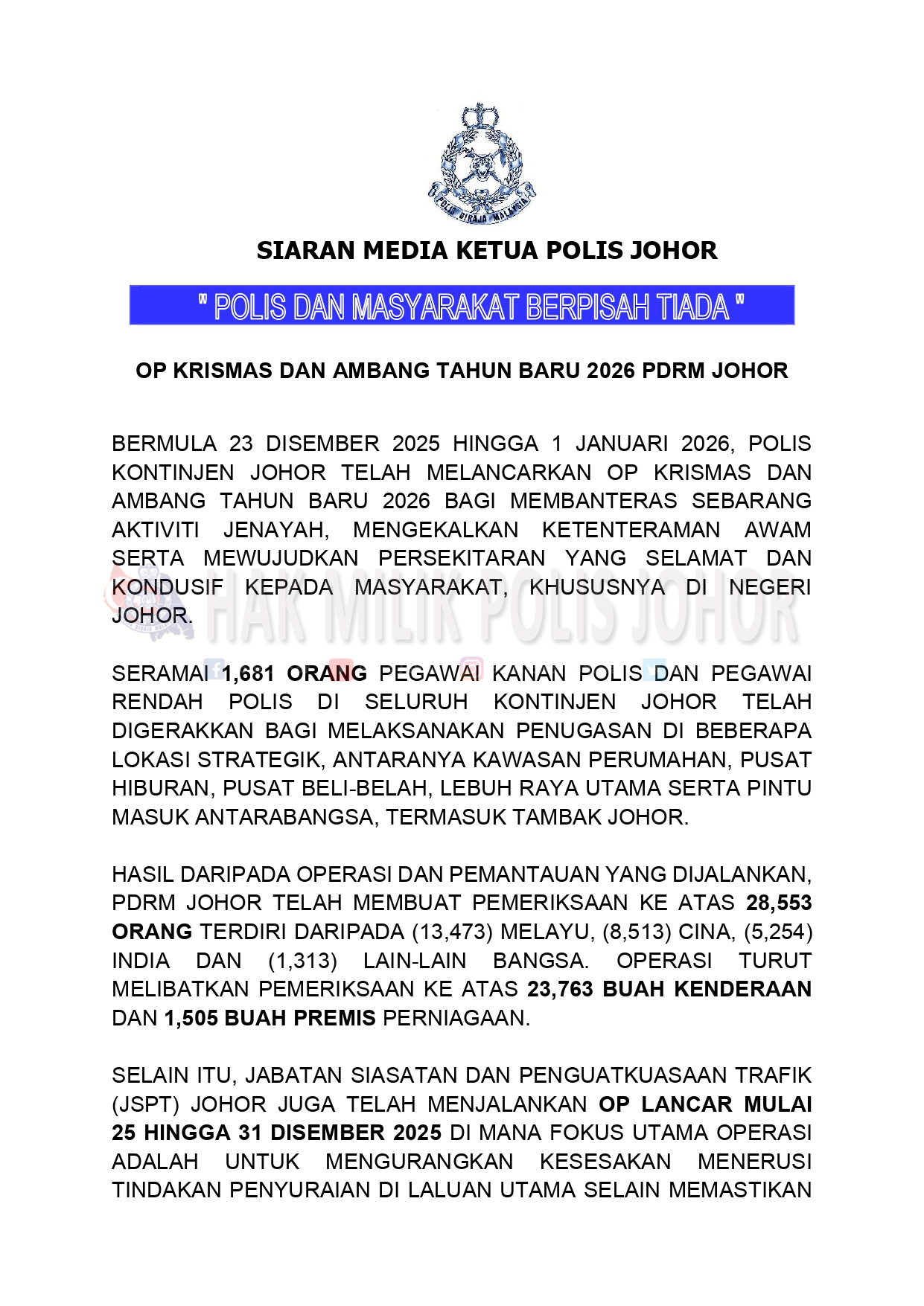 Dalam pada itu, Jabatan Siasatan dan Penguatkuasaan Trafik (JSPT) Johor juga melaksanakan Op Lancar dari 25 hingga 31 Disember, dengan fokus mengurangkan kesesakan lalu lintas menerusi tindakan penyuraian di laluan utama.