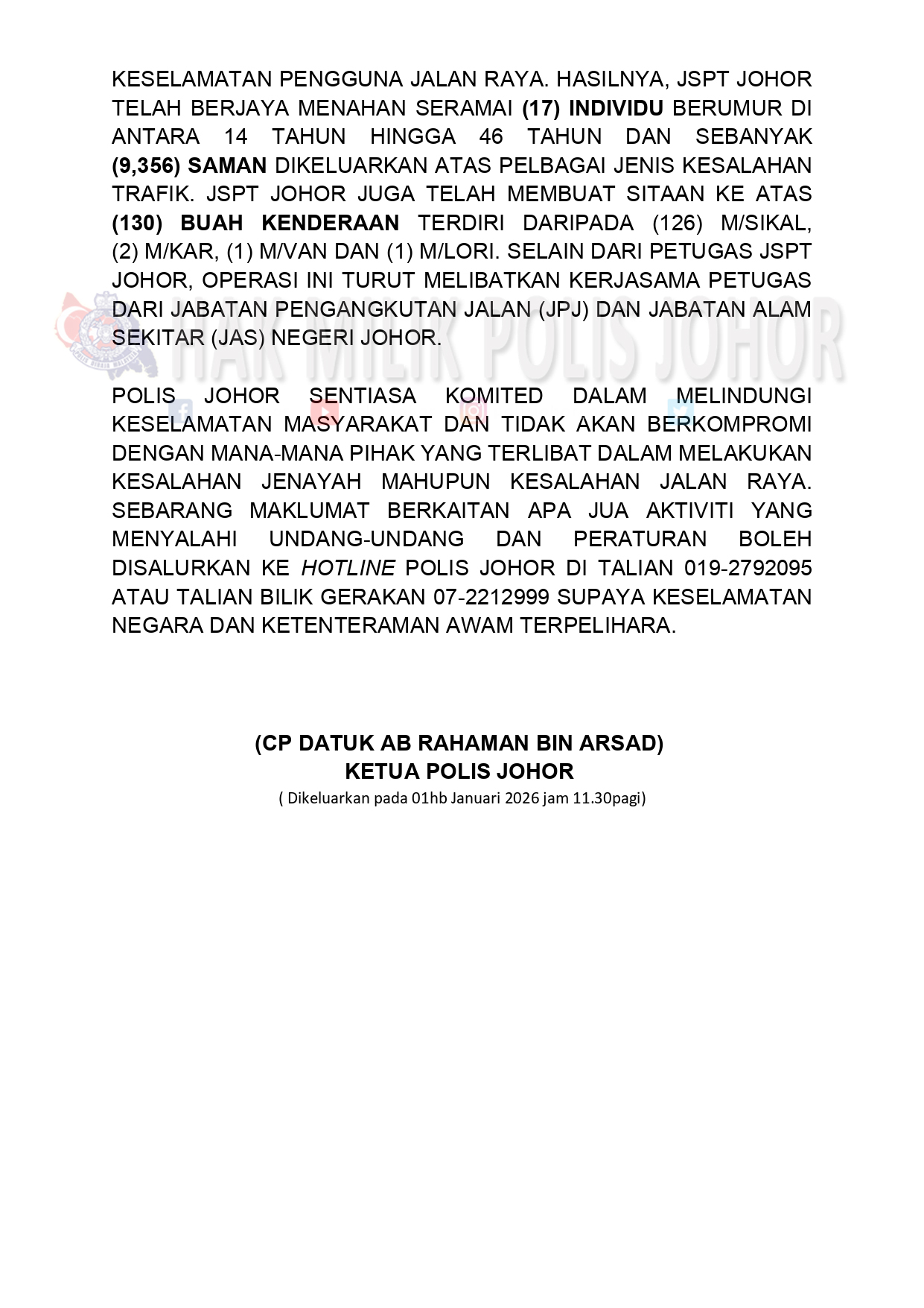 “Polis Johor sentiasa komited melindungi keselamatan masyarakat dan tidak akan berkompromi terhadap sebarang kesalahan jenayah atau pelanggaran undang-undang jalan raya,” katanya.