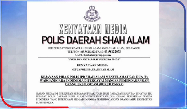 SHAH ALAM, 20 Disember - Dua pembantu rumah warga Indonesia yang disyaki menjadi mangsa pemerdagangan manusia melibatkan buruh paksa diselamatkan polis dalam satu serbuan di sebuah kediaman di Kayangan Heights, di sini, Khamis lalu.