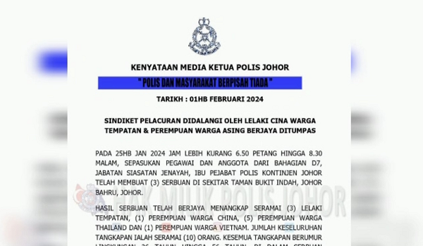 Ketua Polis Johor, Komisioner Polis S. M. M. Kumar dalam satu kenyataan berkata, tangkapan suspek yang berumur 26 hingga 56 tahun itu dijalankan menerusi tiga serbuan.