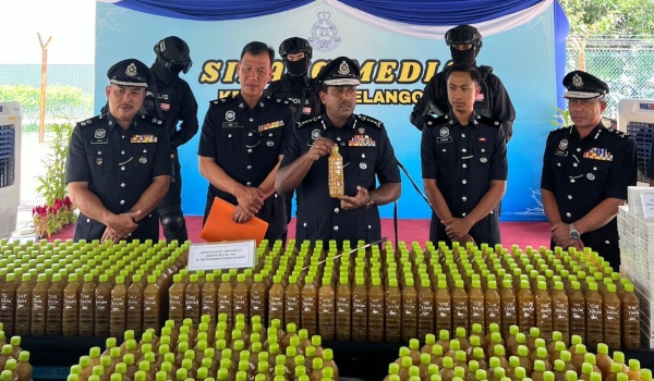 “Kita juga telah merampas sebanyak 1,100 botol air ketum yang sedia untuk dijual. Setiap botol ini lebih kurang 500 mililiters,” katanya ketika sidang media di Selangor.