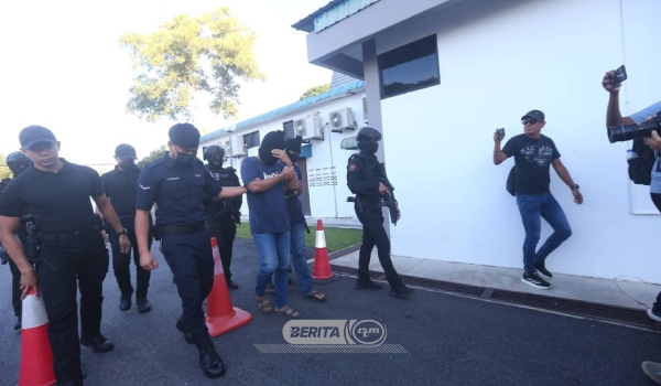 Kenderaan polis membawa kedua-dua suspek tiba di perkarangan mahkamah kira-kira pukul 8.15 pagi.