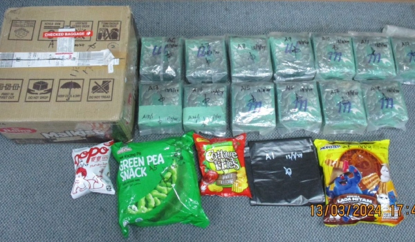 Sementara itu, dalam kes berasingan pada 14 Mac sekitar pada pukul 12.00 tengah hari, JKDM Sibu menyita sebuah kotak yang tidak dituntut di Lapangan Terbang Sibu yang turut didapati berisi sejumlah 13 bungkusan dadah berbahaya jenis methamphetamine dengan berat kasar 13.26 kilogram dengan nilai pasaran dianggarkan bernilai RM437,580.