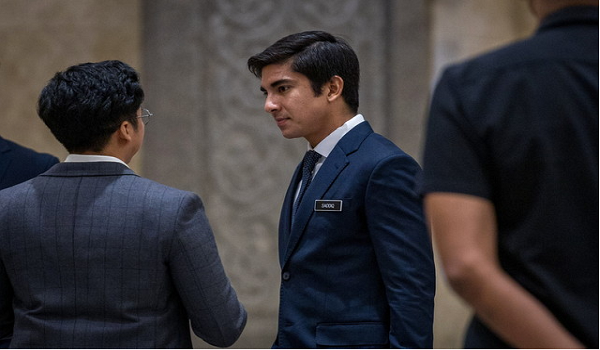 Bekas Menteri Belia dan Sukan itu, tiba di perkarangan mahkamah kira-kira jam 8.39 pagi ditemani ibunya.