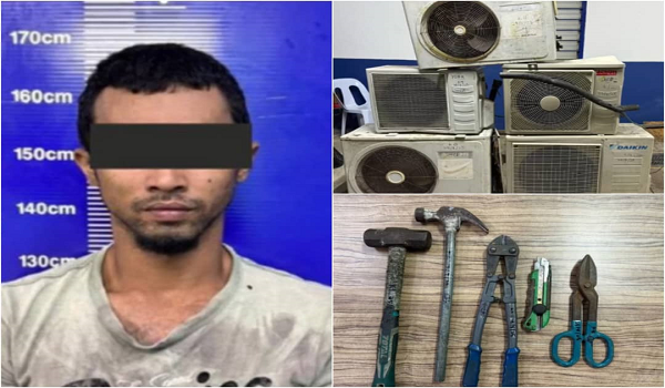 Dalam serbuan itu, polis turut merampas lima unit kompresor penghawa dingin, tiga guni berisi kulit kabel berwarna hitam bertulis ‘Telekom Malaysia Berhad’, sebilah pisau boleh laras, serta beberapa barangan lain.