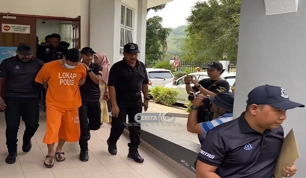 Suspek yang memakai baju lokap berwarna jingga itu direman bagi membantu siasatan dan kes disiasat mengikut Seksyen 302 Kanun Keseksaan.