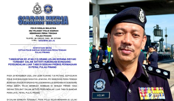 BUKIT MERTAJAM, 30 November – Seramai 13 lelaki ditahan dalam serbuan di sebuah premis perniagaan di Bandar Perai Jaya di sini, selepas disyaki terlibat dalam aktiviti hubungan songsang dan persundalan luar tabii, semalam.