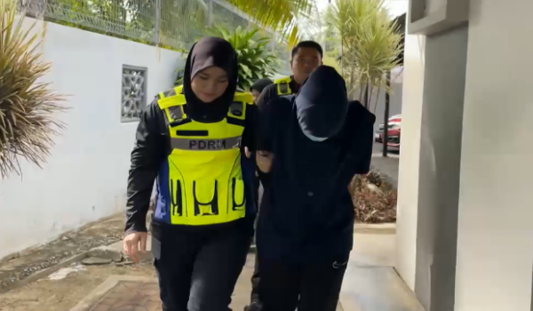 Terdahulu, suspek tiba di pekarangan Mahkamah Majistret Bachok kira-kira pukul 9.41 pagi dengan menaiki kenderaan polis.