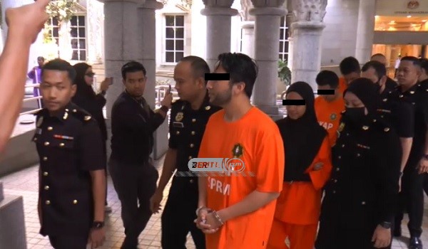 Mereka yang diiringi pegawai SPRM dibawa ke aras dua dengan berpakaian warna oren dan bergari pada jam 9.19 pagi dalam keadaan bergari.