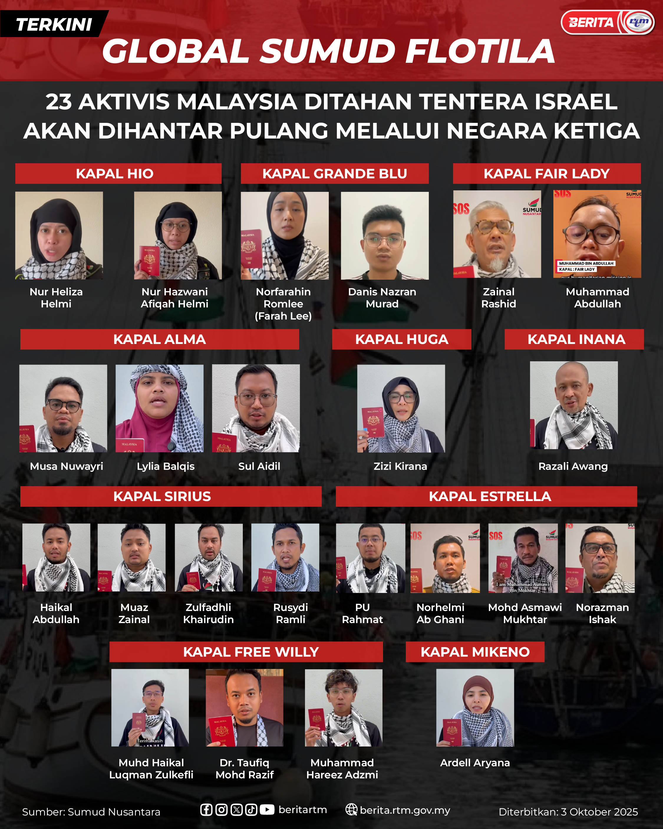 23 Aktivis Malaysia ditahan tentera Israel akan dihantar pulang melalui negara ketiga.