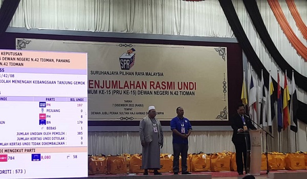 Keputusan itu diumumkan secara rasmi oleh Pegawai Pengurus Pilihan Raya, Rompin, Datuk Ahmad Nasim Datuk Mohd Sidek sebaik penjumlahan undi selesai Dewan Negeri (DUN) Tioman di Dewan Jubli Perak Sultan Haji Ahmad Shah, Rompin.