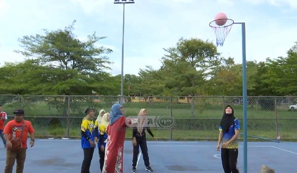 (Asmaiza Ahmad bermain bola jaring pada Program Santai Bersukan Anak Muda)