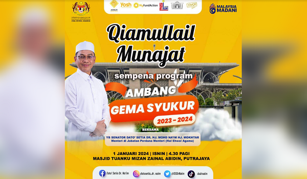 PUTRAJAYA, 1 Januari – Majlis Qiamullail Tahun Baharu di Masjid Tuanku Mizan Zainal Abidin di sini dihadiri hampir 1,000 umat Islam, bersempena dengan sambutan ambang Tahun Baharu 2024 dan sebagai tanda solidariti kepada rakyat Palestin.