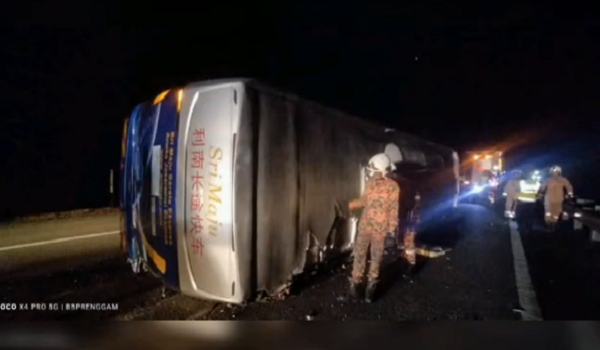 KLUANG, 4 November– Seramai 12 penumpang yang menaiki bas ekpres berdepan detik cemas selepas bas dinaiki terbalik di Kilometer 51, Lebuh Raya Utara Selatan, awal pagi tadi.