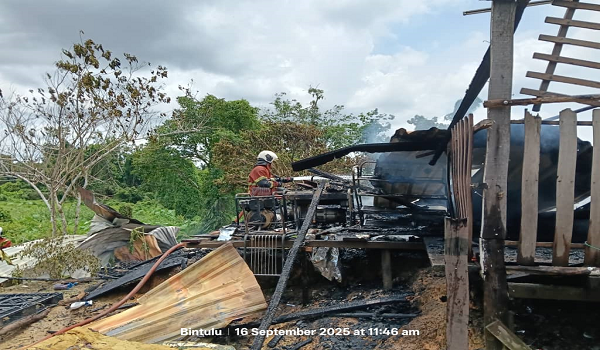 BINTULU, 16 September - Dua buah rumah setinggan berhampiran San-San Garden, di sini, musnah sepenuhnya dalam kebakaran sekitar pukul 11.25 pagi tadi.