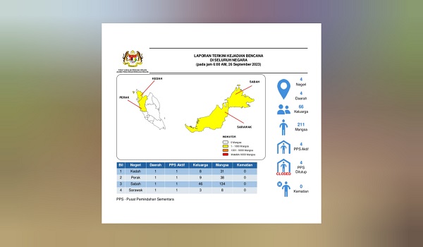 KUALA LUMPUR, 26 September- Penduduk terjejas banjir di empat negeri iaitu Sabah, Sarawak, Kedah dan Perak meningkat kepada 211 orang, setakat pukul 6.00 pagi tadi.
