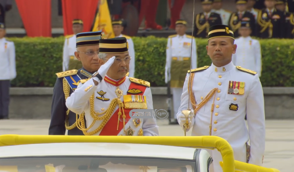 Istiadat dimulakan dengan perbarisan mempersembahkan ‘Hormat Diraja’ Negaraku diikuti Tembakan Kehormatan 21 das oleh 41 Bateri Rejimen Artileri Diraja (Istiadat) yang diketuai Leftenan Kolonel Mohammad Asri Che Wil dan Terbang Lintas oleh lima helikopter Angkatan Tentera Malaysia (ATM).