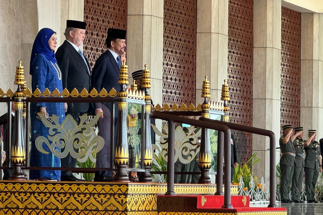 Sultan Ibrahim diiringi Sultan Hassanal Bolkiah berkenan memeriksa perbarisan kawalan kehormatan daripada Angkatan Bersenjata Diraja Brunei, Tentera Darat Diraja Brunei.