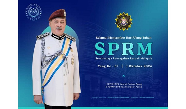 KUALA LUMPUR, 1 Oktober- Yang di-Pertuan Agong Sultan Ibrahim menzahirkan ucapan tahniah kepada kepada seluruh warga Suruhanjaya Pencegahan Rasuah Malaysia (SPRM) sempena ulang tahun ke-57 suruhanjaya itu, hari ini.