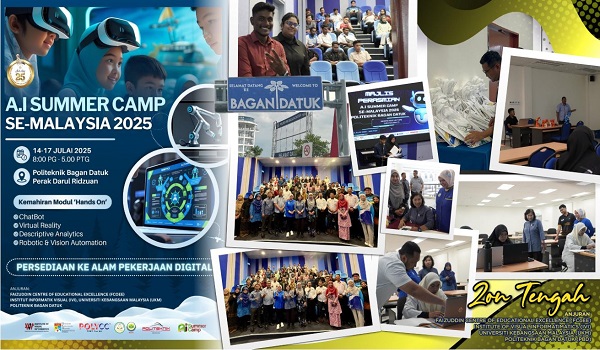 Ketika ini, AI Summer Camp Se-Malaysia 2025 sedang berlangsung di Politeknik Bagan Datuk, Perak selama empat hari hingga esok (17 Julai), melibatkan 80 peserta dari politeknik dan kolej komuniti bagi Zon Tengah.