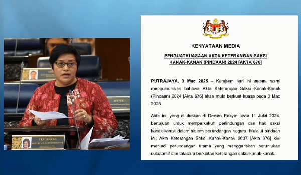 KUALA LUMPUR, 3 Mac- Kerajaan hari ini secara rasmi mengumumkan Akta Keterangan Saksi Kanak-Kanak (Pindaan) 2024 [Akta 676] akan mula berkuat kuasa hari ini.