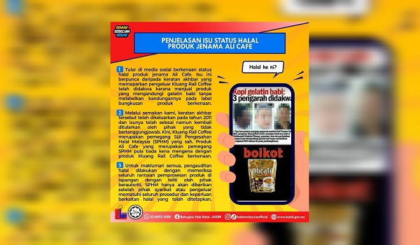 “Isu ini berpunca daripada keratan akhbar yang memaparkan pengeluar Kluang Rail Coffee telah didakwa kerana menjual produk yang mengandungi gelatin babi tanpa melabelkan kandungannya pada label bungkusan produk berkenaan.