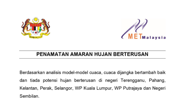 “Amaran hujan berterusan tahap buruk yang turut dikeluarkan bagi Pahang (Jerantut dan Kuantan) juga ditamatkan.