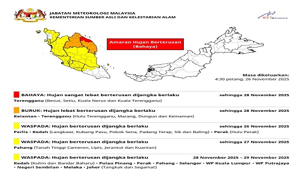 KUALA LUMPUR, 26 November – METMalaysia mengeluarkan amaran hujan berterusan melibatkan beberapa negeri di Semenanjung sehingga 29 November.