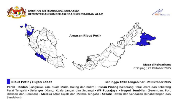 KUALA LUMPUR, 29 Oktober -Jabatan Meteorologi Malaysia (MetMalaysia) hari ini mengeluarkan amaran ribut petir disertai hujan lebat serta angin kencang yang dijangka melanda beberapa kawasan di seluruh negara hingga 12 tengah hari ini.