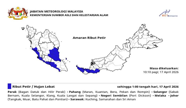 KUALA LUMPUR, 17 April – Jabatan Meteorologi Malaysia (MetMalaysia) mengeluarkan amaran ribut petir, hujan lebat dan angin kencang di tujuh negeri hingga 1 tengah hari ini.