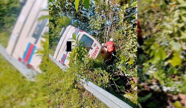 Ia melaporkan satu kemalangan melibatkan ambulans terbabit terbabas dan terbalik ke tepi jalan.