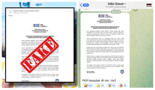 KUALA LUMPUR, 30 April - Kenyataan media kononnya dikeluarkan oleh Angkatan Muda Keadilan (AMK) Alor Setar berhubung Himpunan MADANI Kedah 2023, adalah palsu.