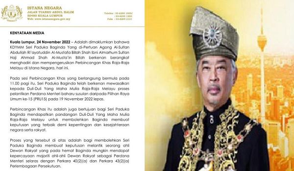 “Seri Paduka Baginda telah berkenan mewasalkan kepada Duli-Duli Yang Maha Mulia Raja-Raja Melayu proses pelantikan Perdana Menteri baharu susulan daripada Pilihan Raya Umum ke-15 (PRU15) pada 19 November 2022 lepas,” menurut kenyataan itu.