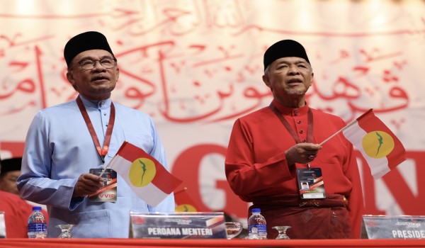 Perdana Menteri turut dilihat mengibarkan bendera Sang Saka Bangsa ketika lagu rasmi UMNO “Bersatu Bersetia Berkhidmat” dimainkan.