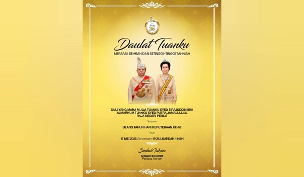 KUALA LUMPUR, 17 Mei- Perdana Menteri, Datuk Seri Anwar Ibrahim merafak sembah ucapan tahniah kepada Raja Perlis, Tuanku Syed Sirajuddin Jamalullail bersempena dengan ulang tahun keputeraan Baginda yang ke-82.